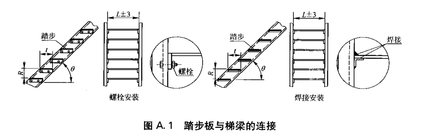 (8)踏步板與樓梯的鏈接采用焊接或螺栓固定,見圖A.1。采用螺栓固定時(shí),螺栓規(guī)格不得小于M10。